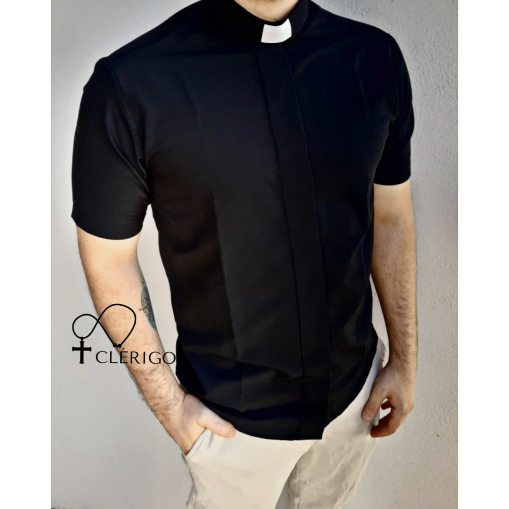 Camisa Gola Clerical manga curta sem bolso. Costure manualmente os botões na gola metade de cada encaixe de ambos os lados da peça.