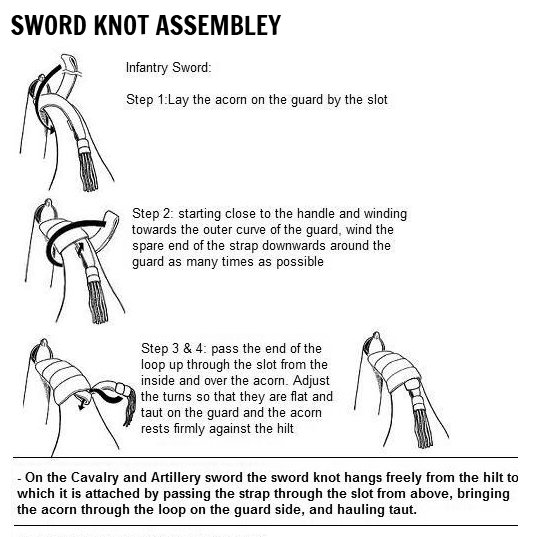 There are knots within knots pilgrim. Theyre all fairly simple and easy to learn. The sword knot is simply looped onto the top end of the narrow part of the guard and left to dangle if you are a cavalryman or an infantry field officer or the adj.